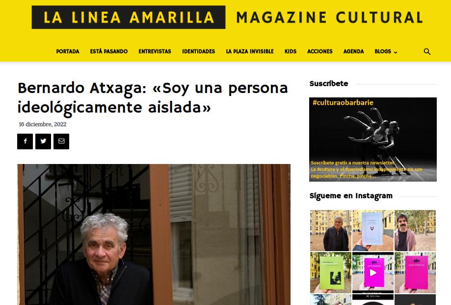 El magazine cultural online La Línea Amarilla ha entrevistado a Bernardo Atxaga. Entre otros contenidos, se incluye un poema inédito que aparecerá en un nuevo libro en 2023: El diccionario de las piedras (Harriaren Hiztegia).